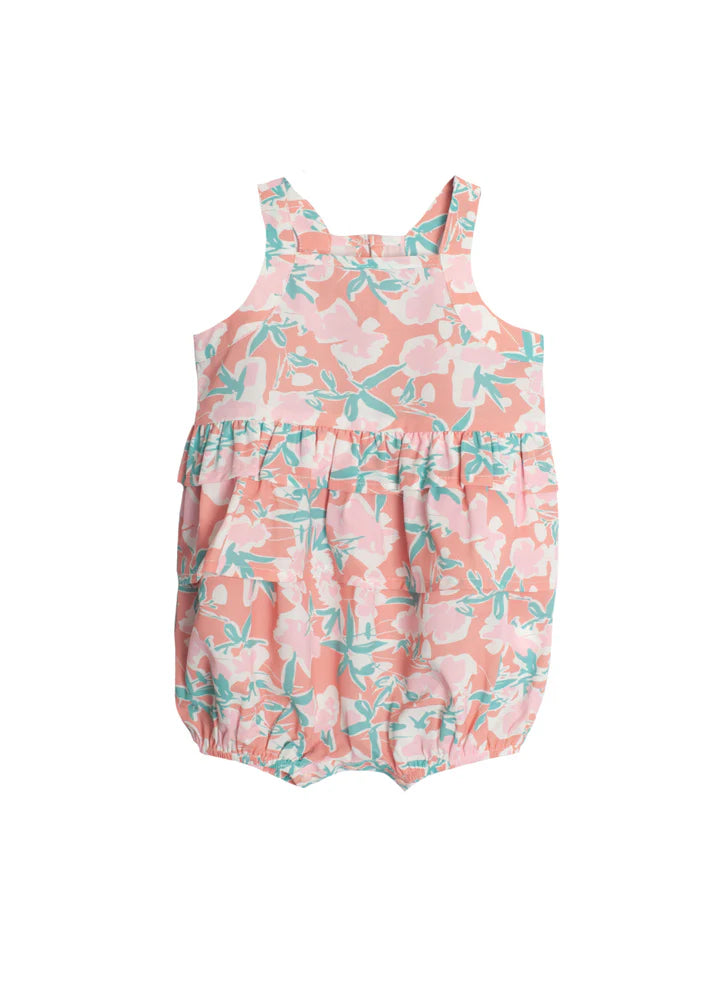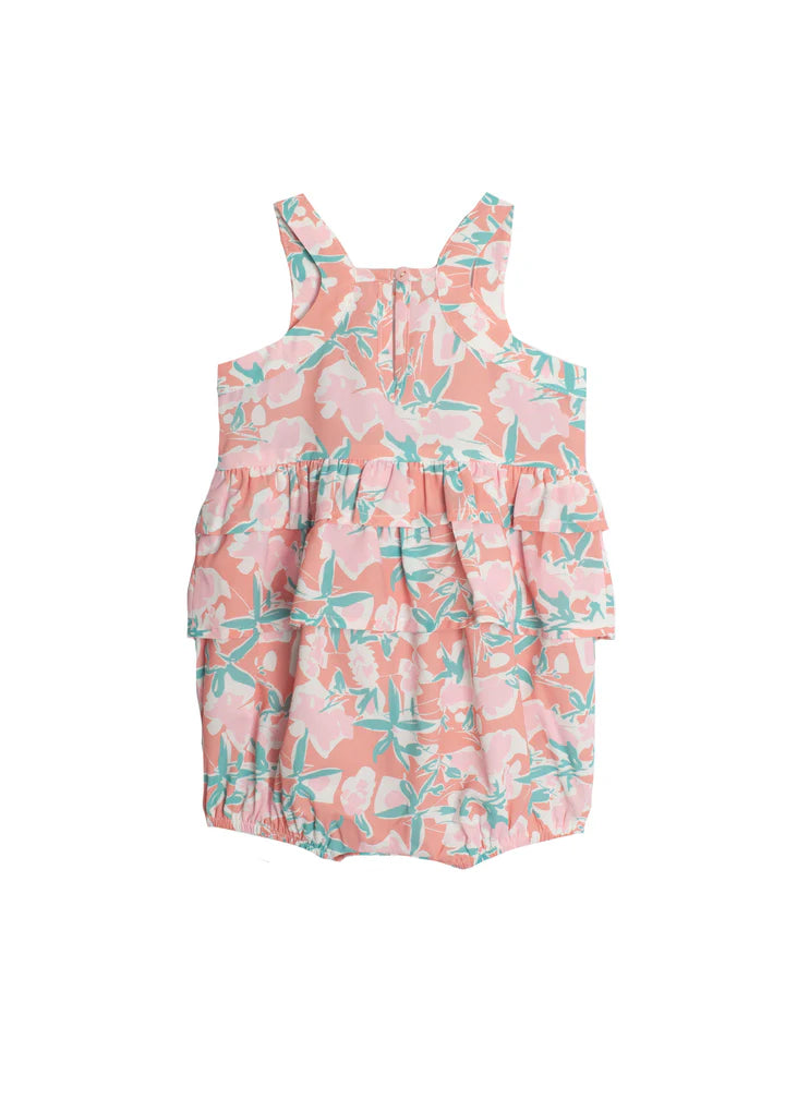 This enchanting romper blooms with a sleeveless design, crafted from soft, breathable cotton. Adorned with a coral and teal floral print, it features delicate ruffle accents along the shoulders, creating a playful yet elegant silhouette perfect for sunny days. Headband not included.