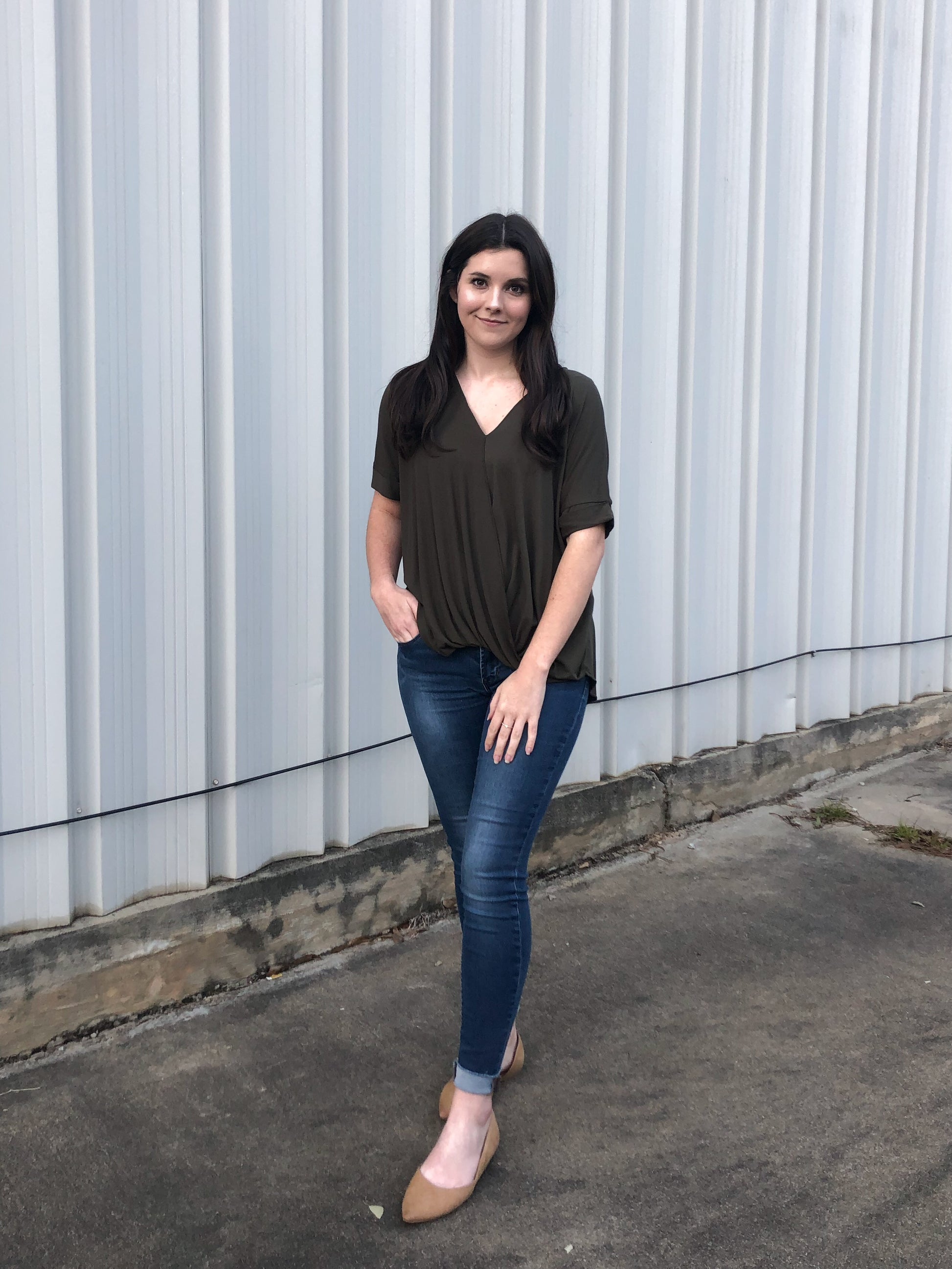 Danielle is 5'5" and 130lbs. She is wearing a small.