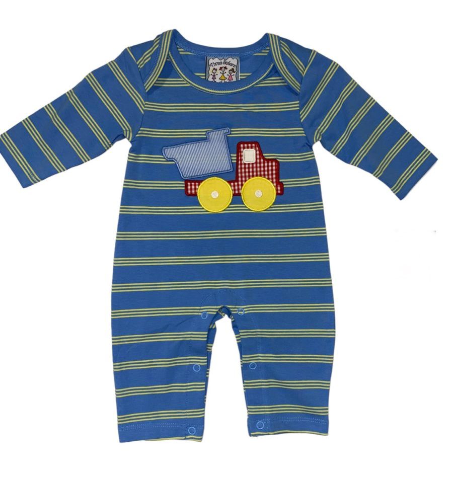 Blue with yellow stripe dump truck applique romper.