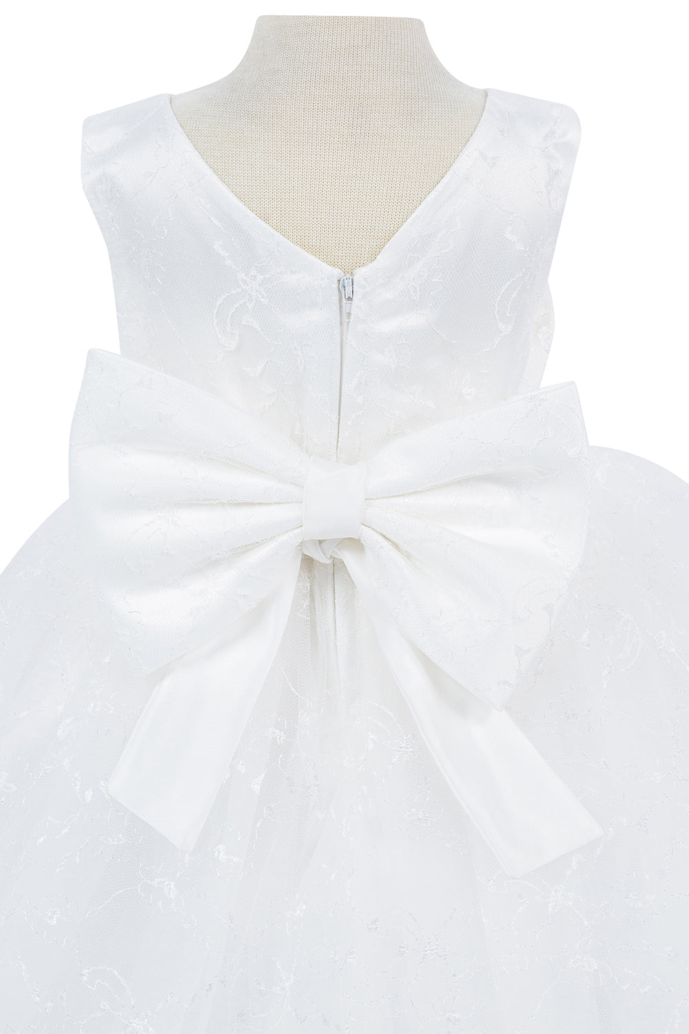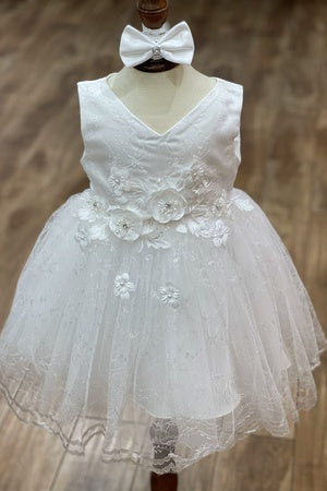 Elegant lace satin baby dress decorated with 3D flower on waist with a huge detachable back ribbon.