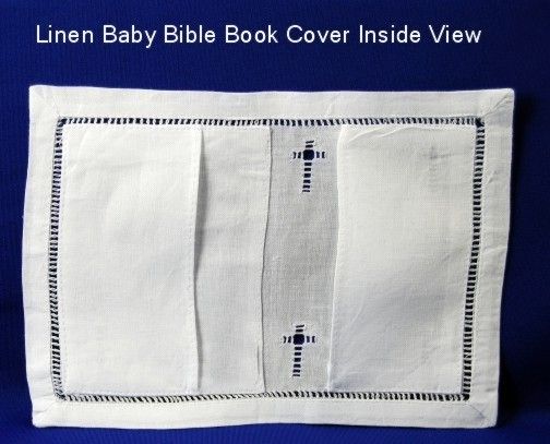 This Linen Hemstitched Baby Bible Book Cover with Baby Bible Set makes a great gift for Birth, Christening, first Christmas, or even First Communion. Hemstitched Crosses adorn the front and back of the linen cover and inner flaps keep the Baby Bible secure.