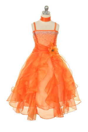 Dazzling two tone cascading rhinestone crystal organza long ruffle dress with detachable matching flower (with hair pin: also can be used for hair) and scarf. Great for all occasions.