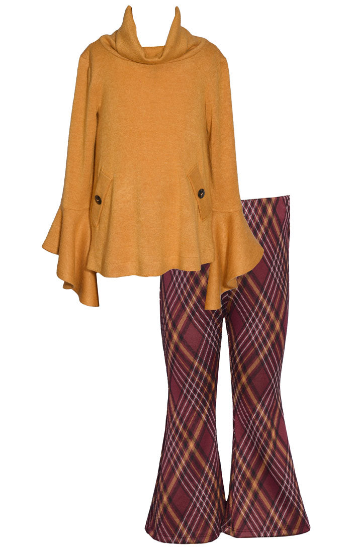Ponte plaid flared pant with mustard cowl neck knit top.