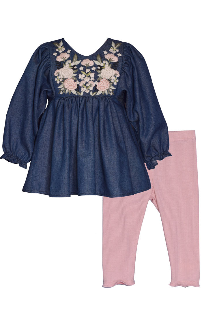 Long sleeved denim set with embroidered yoke and coordinating rib knit legging.