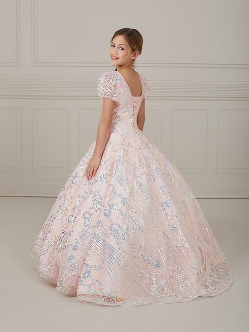 Scoop neckline with puffy sleeves, liquid floral sequins A-line with sweep train and lace-up back.
