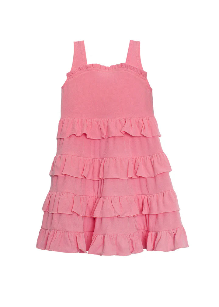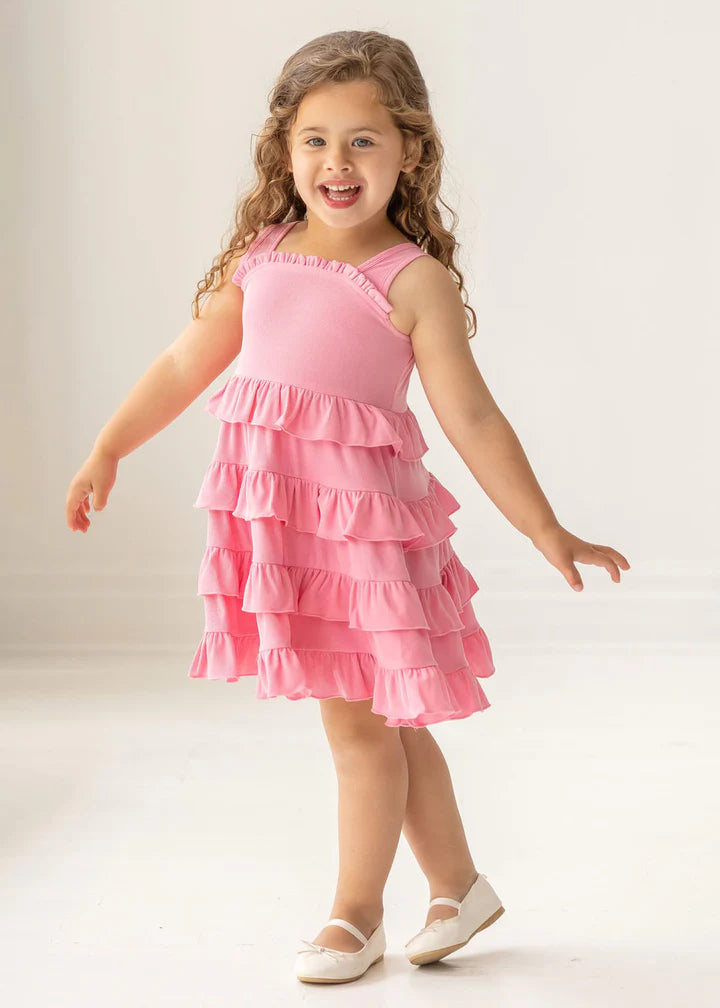 This vibrant sleeveless dress in a playful bubblegum pink features a series of cascading ruffles that create a dynamic, flowing silhouette. Crafted from a soft and breathable fabric, it's ideal for warm days. A classic style with a fun twist.