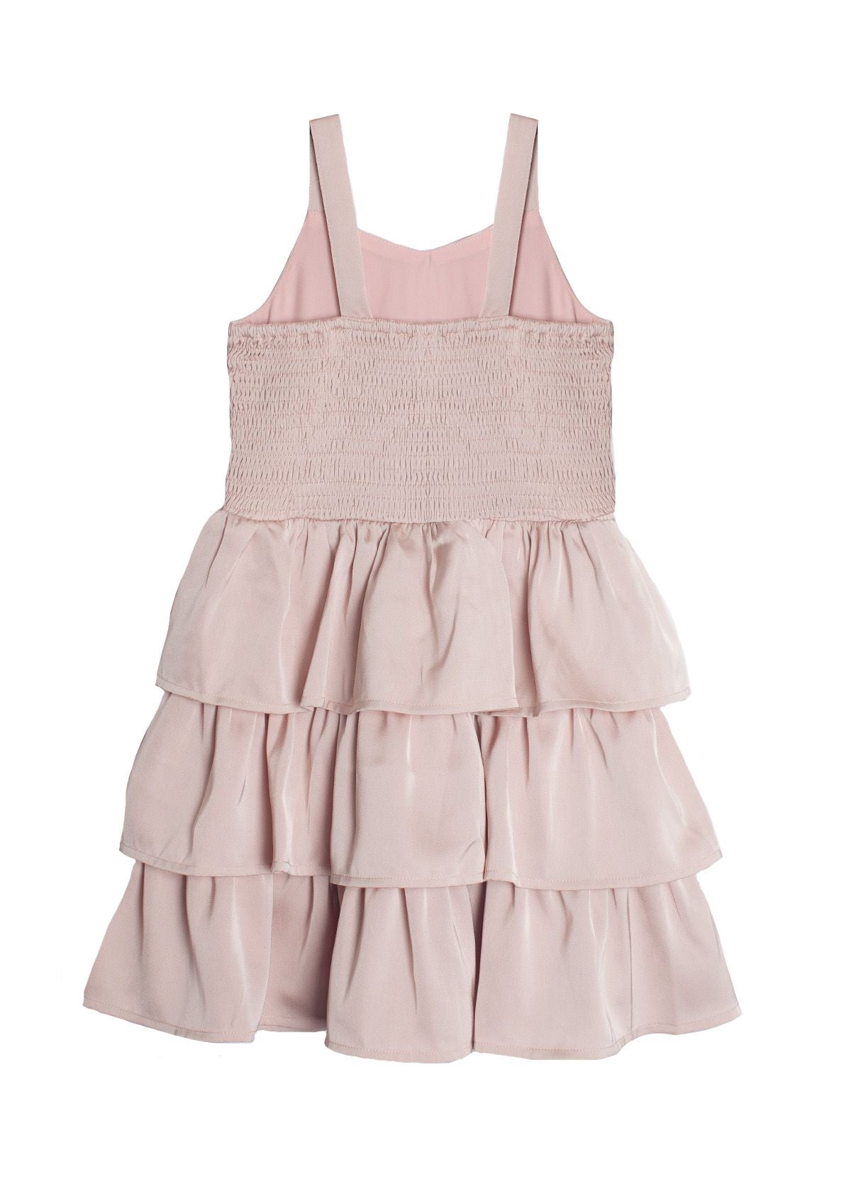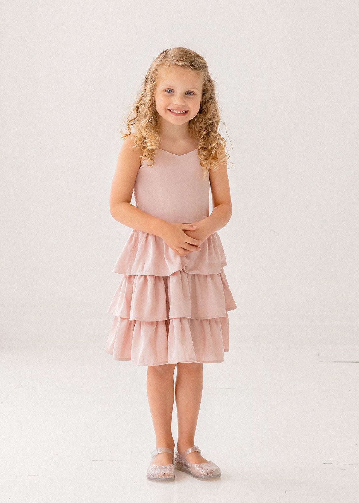 This sleeveless dress is a vision of understated charm with its tiered ruffles and delicate blush pink hue. Crafted from soft, breathable fabric, it's perfect for sunny days. The simple lines and natural waist create a timeless silhouette that's both comfortable and stylish.