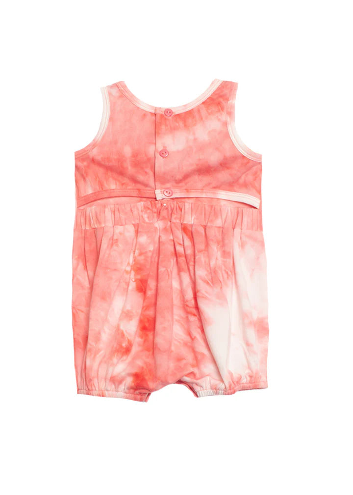 This sleeveless romper is a perfect blend of comfort and style for your little one. Made with soft , breathable cotton, this romper boasts a vibrant coral tie-dye pattern that captures the essence of summer fun. It features on easy pull-on design with gentle elastic of the legs for a snug fit.